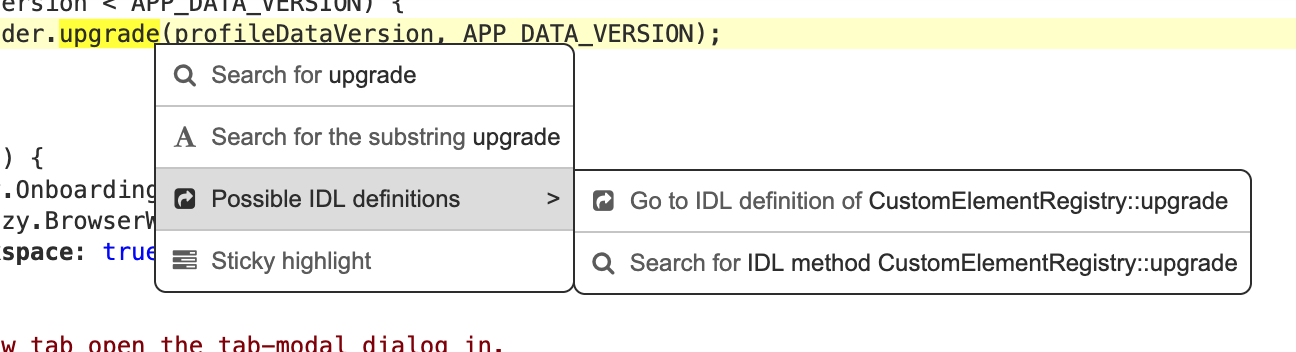 Searchfox provides a custom context menu, which is opened on the primary button click (not the secondary button click, which is for the browser’s built-in context menu).