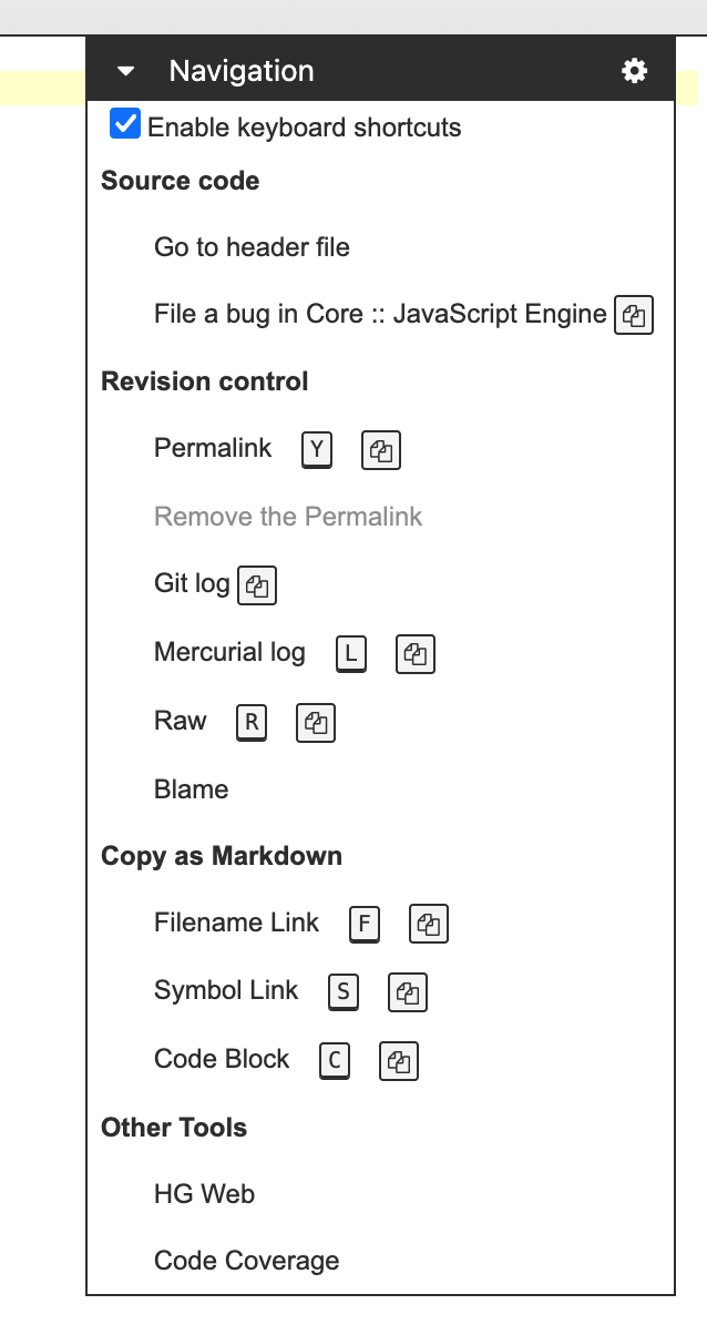 This section provides a feature to copy the selected file/symbol/code as Markdown. This is handy for sharing the reference in bug comments or in chat.